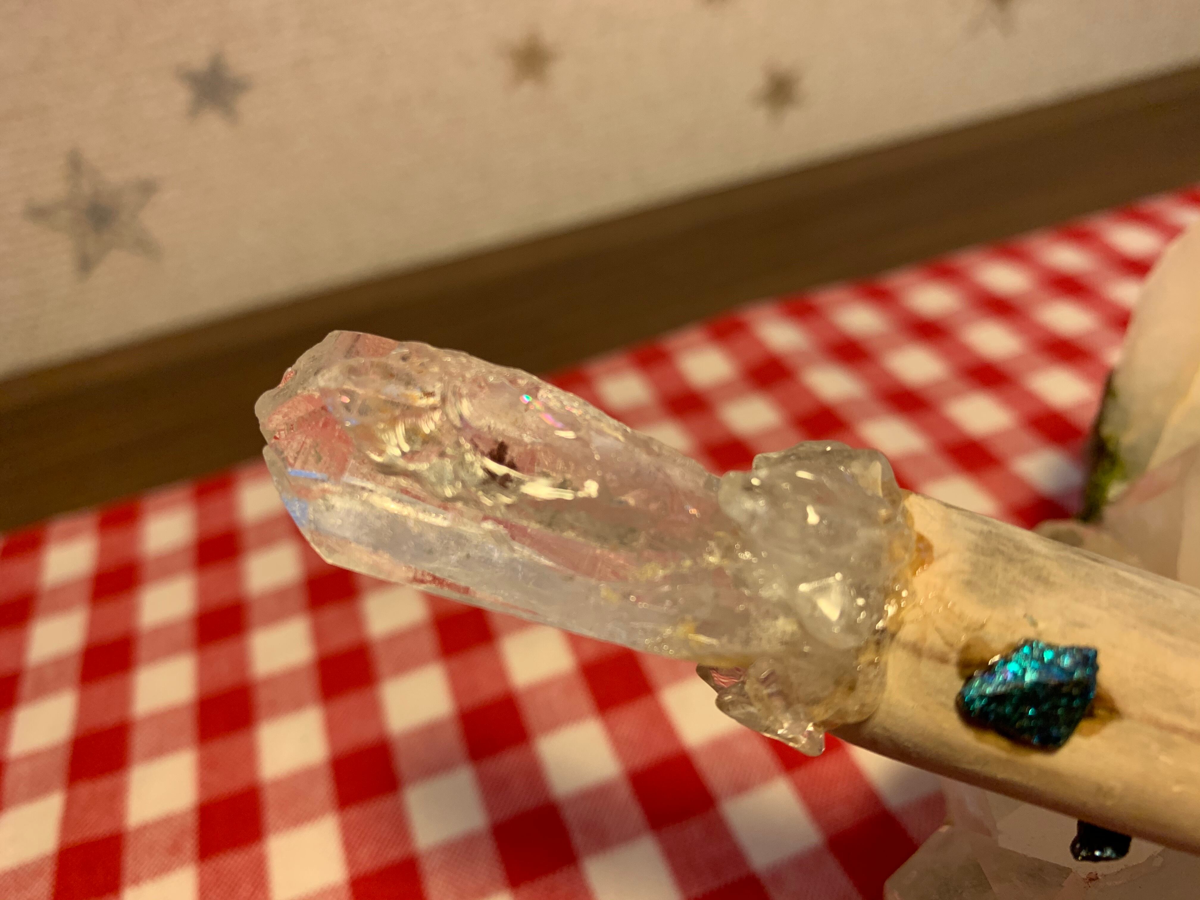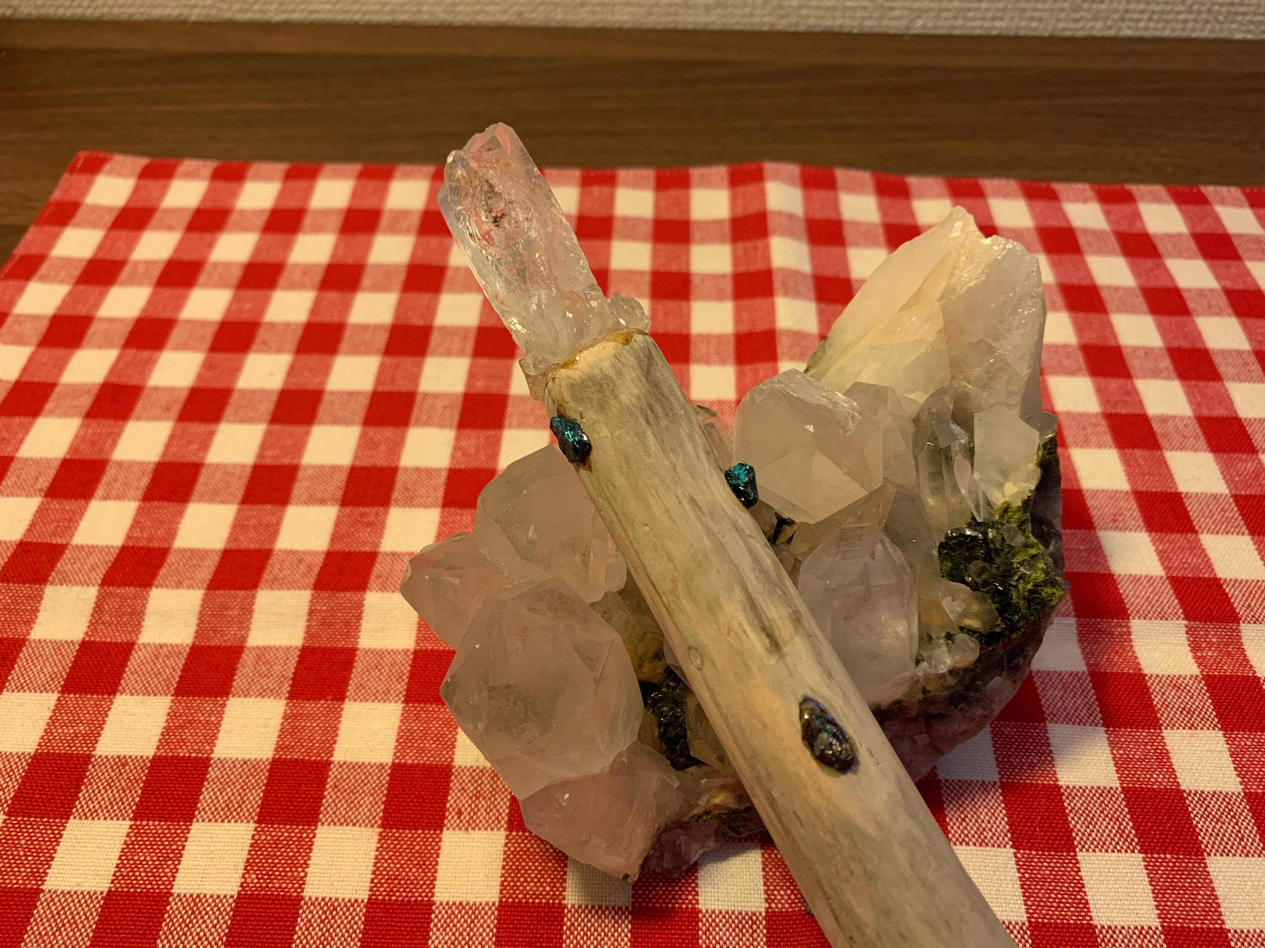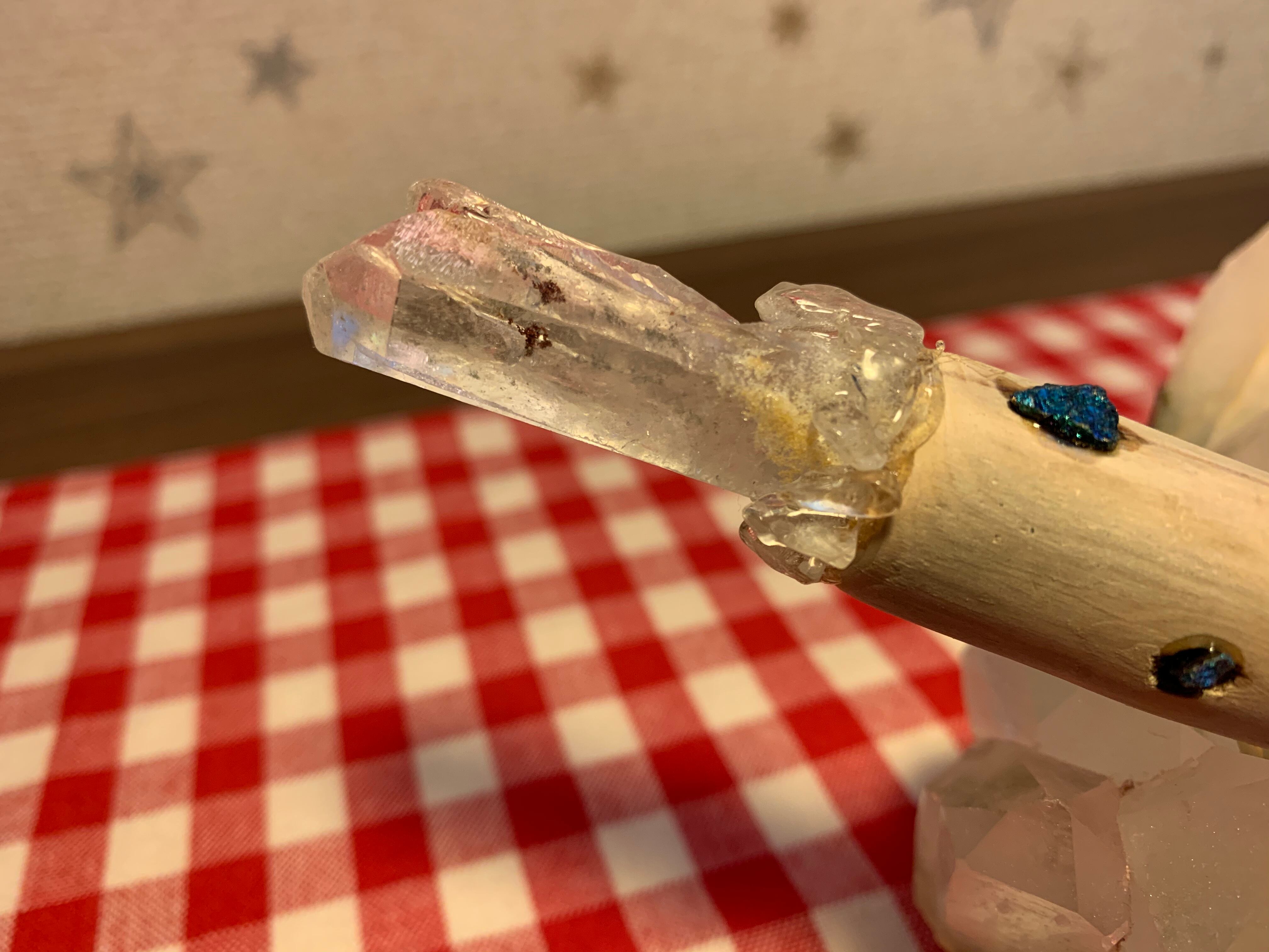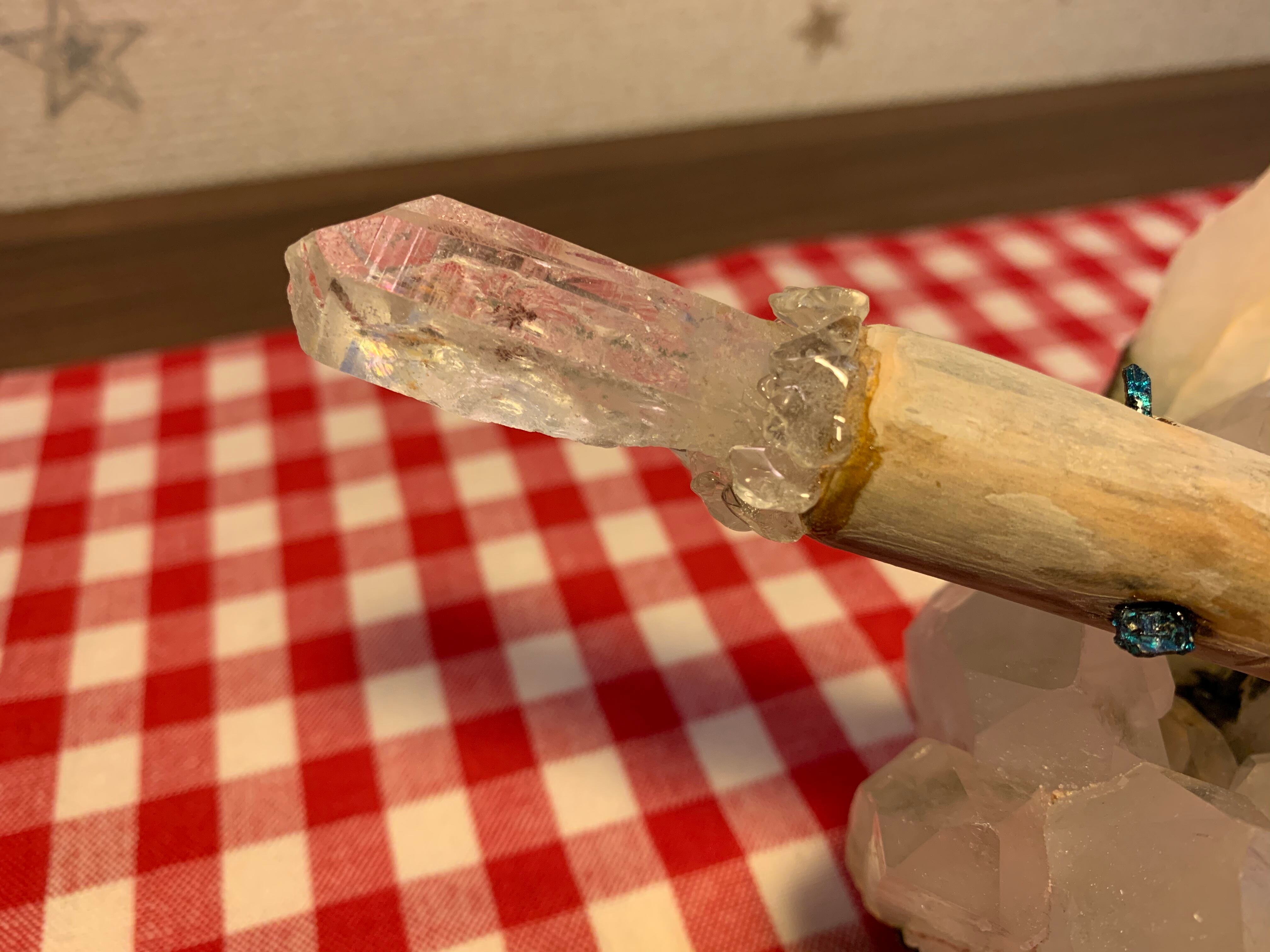 レインボーがうつりこみ、インクリュージョンも1本の筋が入ったパワフルなアーカンソー産クリスタルポイントと、珍しいチャコルパイライトとちらべ、強化なパワーのワンドを製作致しました。